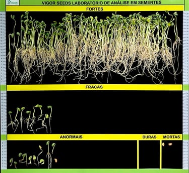 Testamos germinação, vigor e presença de defeitos mecânicos nas sementes.